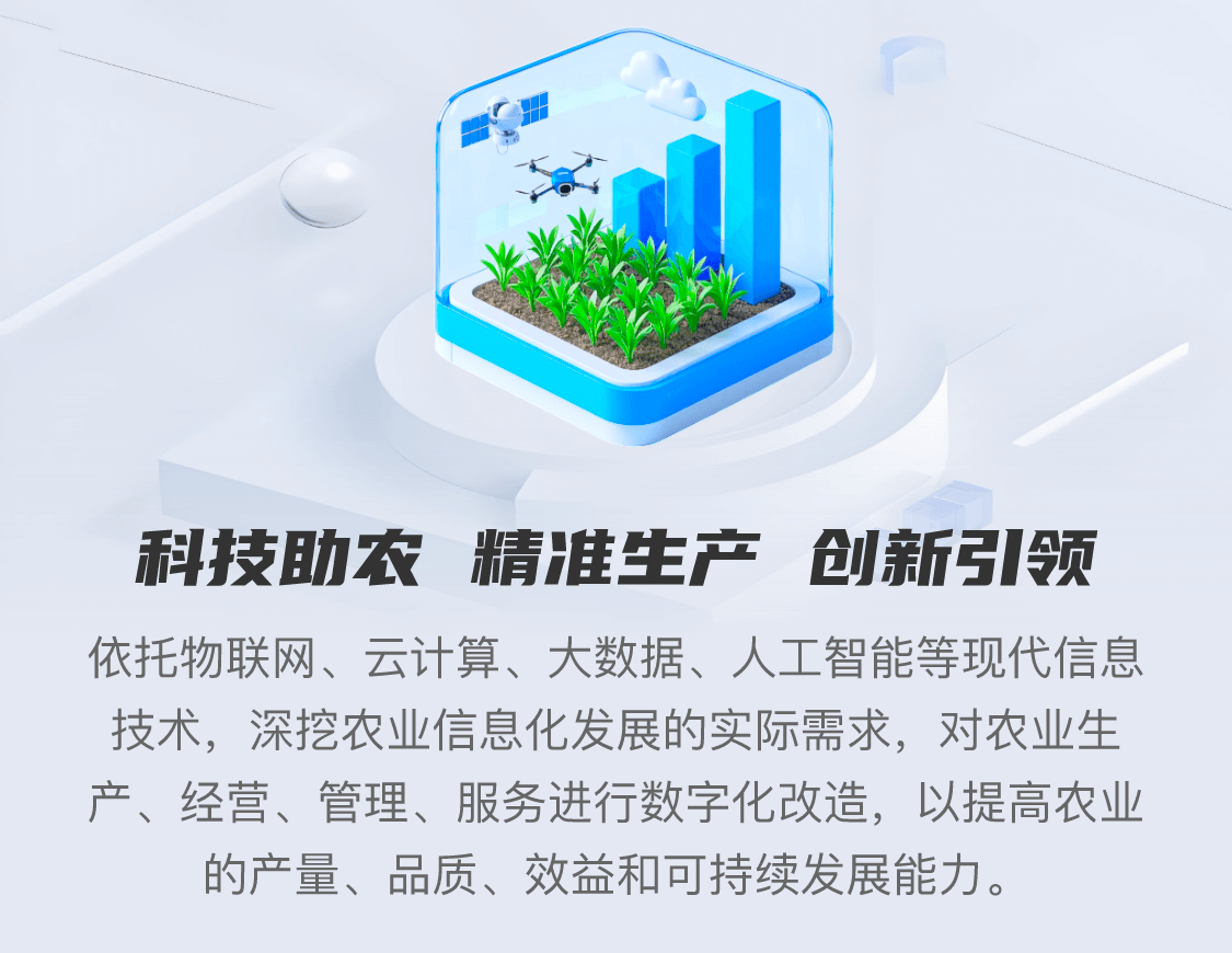 依托物联网、云计算、大数据、人工智能等现代信息技术,深挖农业信息化发展的实际需求,对农业生产、经营、管理、服务进行数字化改造,以提高农业的产量、品质、效益和可持续发展能力。