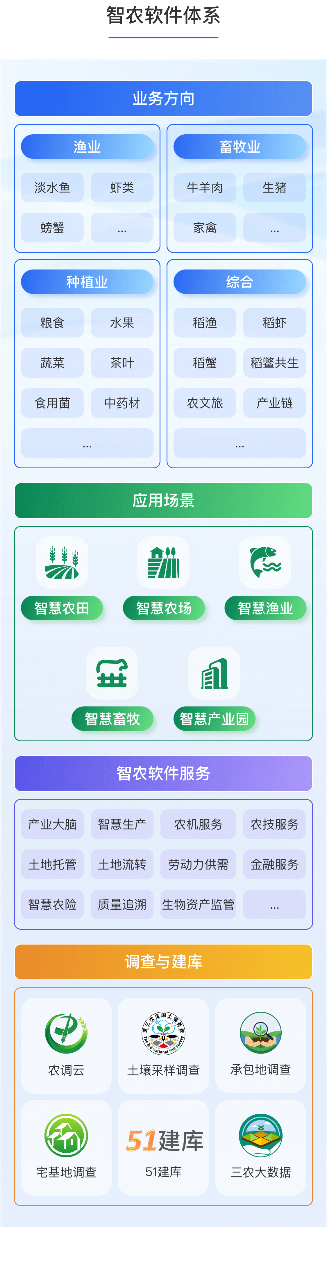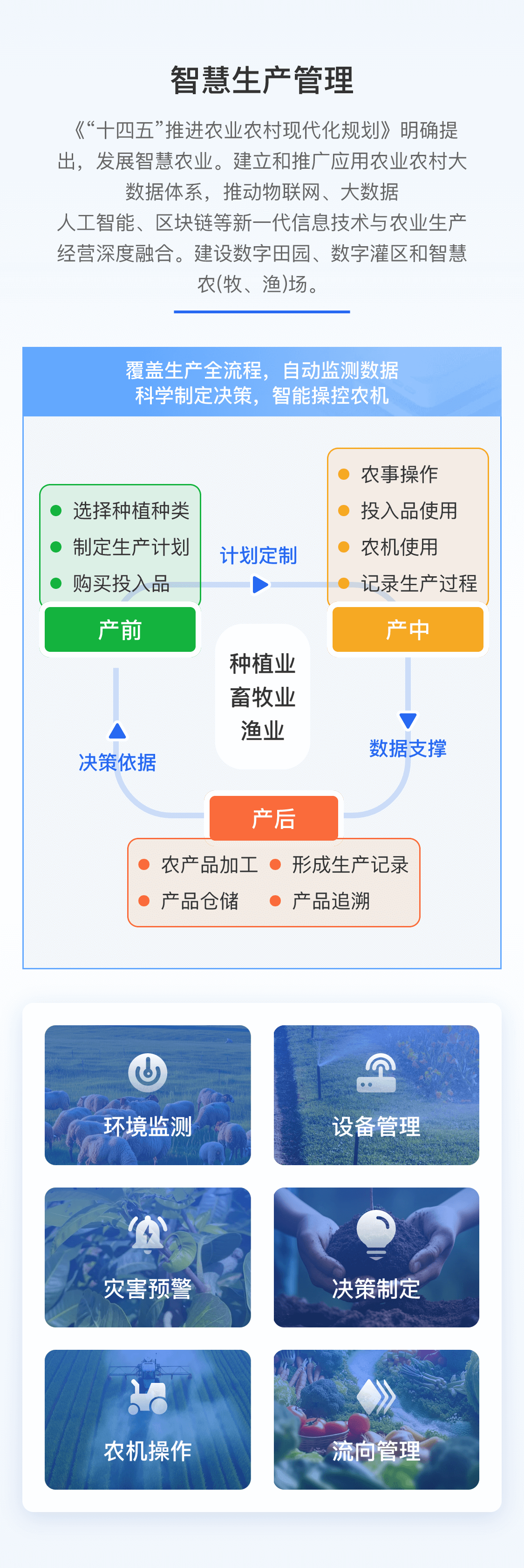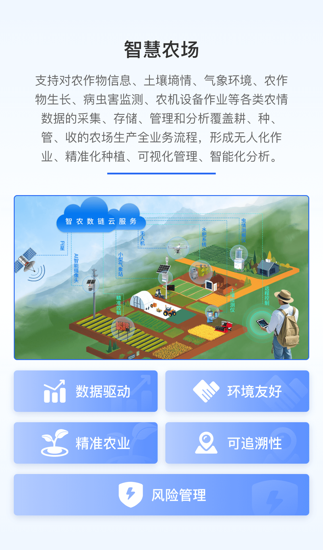 支持对农作物信息、土壤墒情、气象环境、农作物生长、病虫害监测、农机设备作业等各类农情数据的采集、存储、管理和分析覆盖耕、种、管、收的农场生产全业务流程,形成无人化作业、精准化种植、可视化管理、智能化分析。