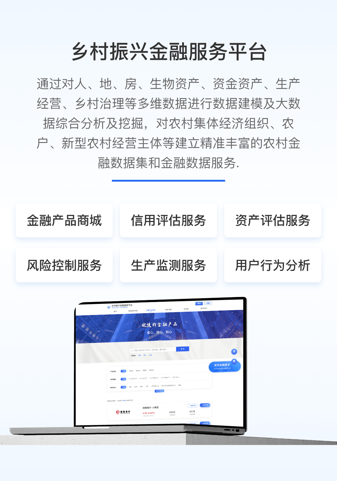 通过对人、地、房、生物资产、资金资产、生产经营、乡村治理等多维数据进行数据建模及大数据综合分析及挖掘,对农村集体经济组织、农户、新型农村经营主体等建立精准丰富的农村金融数据集和金融数据服务.