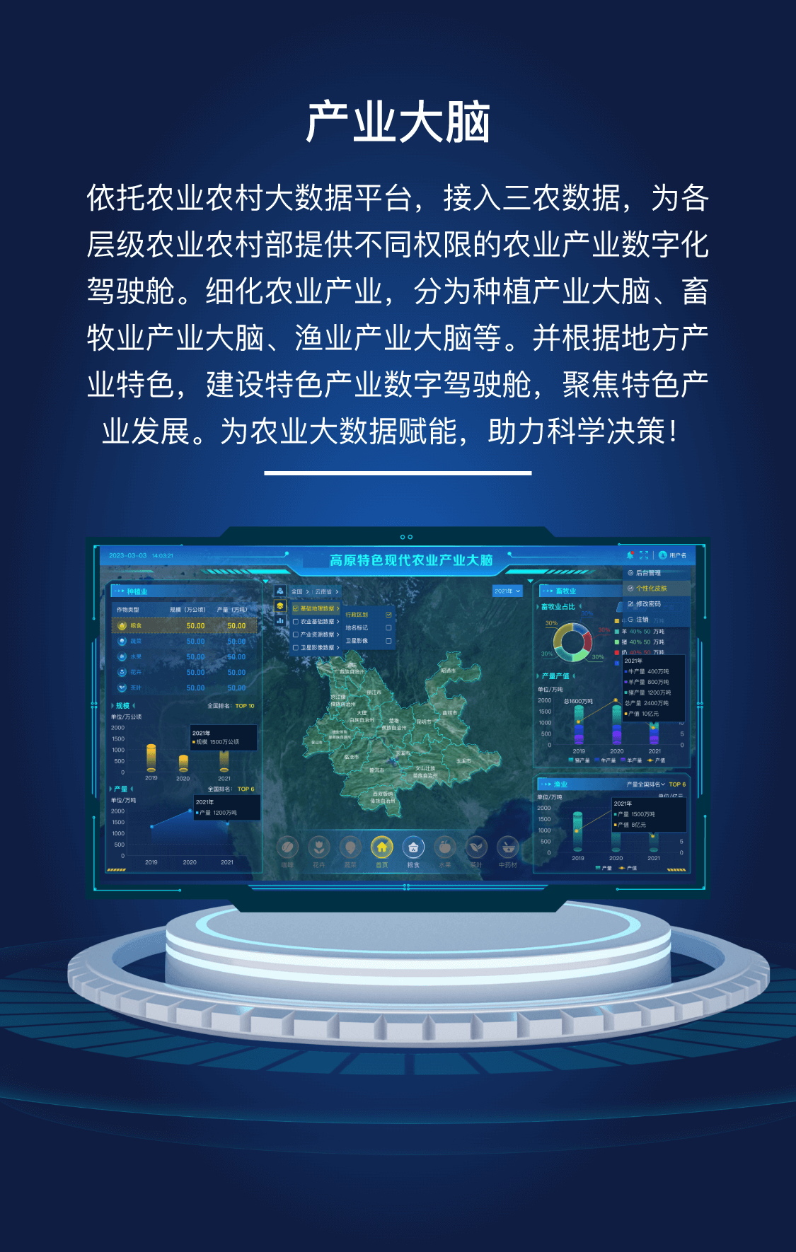 依托农业农村大数据平台,接入三农数据,为各层级农业农村部提供不同权限的农业产业数字化驾驶舱。细化农业产业,分为种植产业大脑、畜牧业产业大脑、渔业产业大脑等。并根据地方产业特色,建设特色产业数字驾驶舱,聚焦特色产业发展。为农业大数据赋能,助力科学决策!