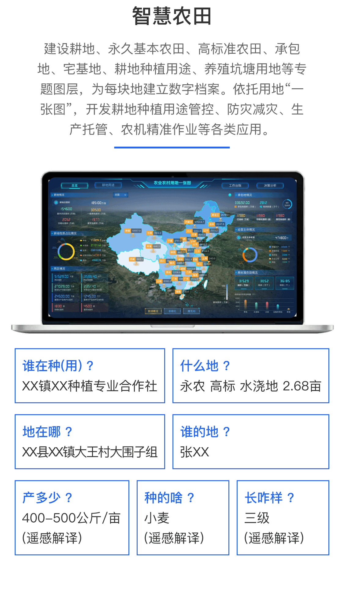 建设耕地、永久基本农田、高标准农田、承包地、宅基地、耕地种植用途、养殖坑塘用地等专题图层,为每块地建立数字档案。依托用地“一张图”,开发耕地种植用途管控、防灾减灾、生产托管、农机精准作业等各类应用。