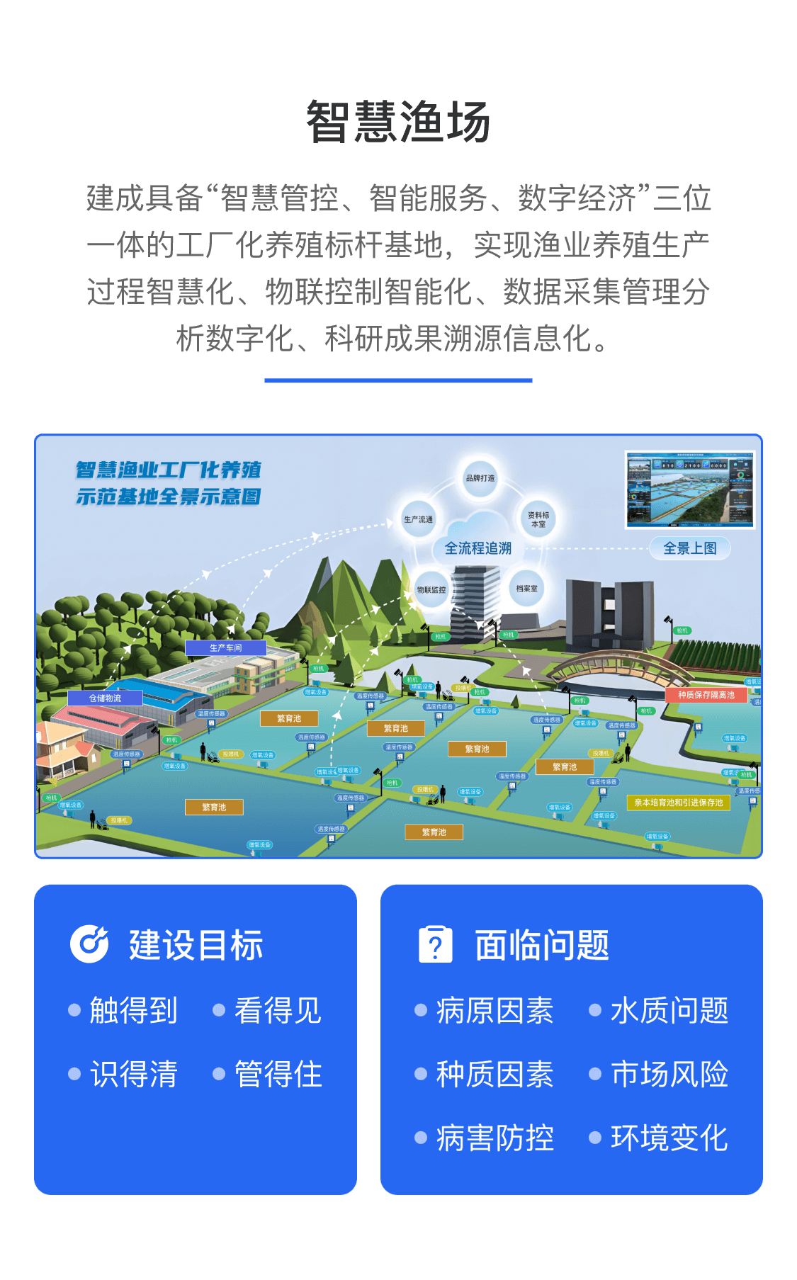 建成具备“智慧管控、智能服务、数字经济”三位一体的工厂化养殖标杆基地,实现渔业养殖生产过程智慧化、物联控制智能化、数据采集管理分析数字化、科研成果溯源信息化。