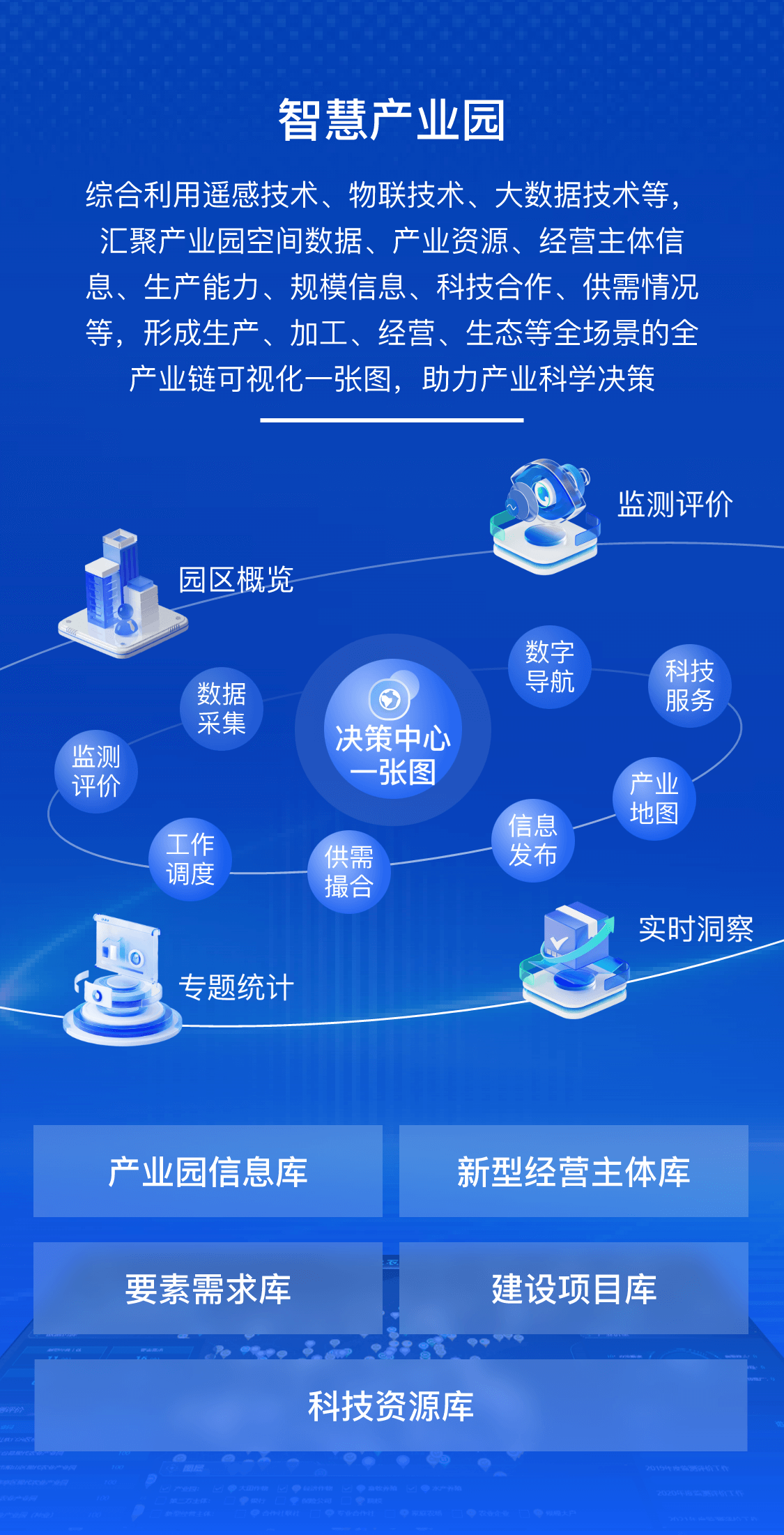 综合利用遥感技术、物联技术、大数据技术等,汇聚产业园空间数据、产业资源、经营主体信息、生产能力、规模信息、科技合作、供需情况等,形成生产、加工、经营、生态等全场景的全产业链可视化一张图,助力产业科学决策