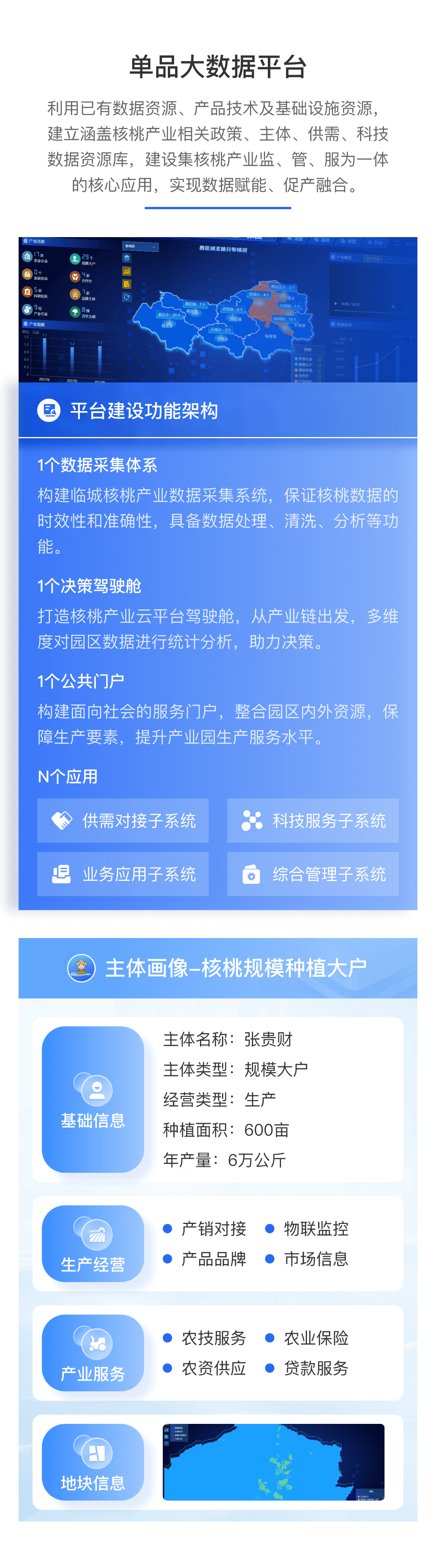利用已有数据资源、产品技术及基础设施资源,建立涵盖核桃产业相关政策、主体、供需、科技数据资源库,建设集核桃产业监、管、服为一体的核心应用,实现数据赋能、促产融合。